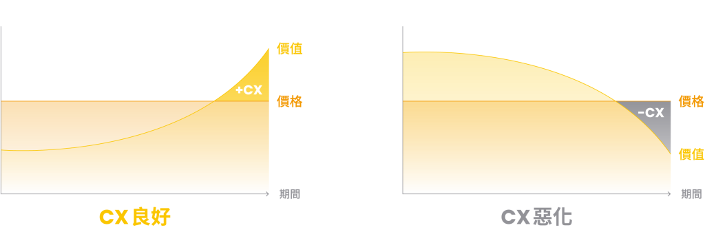 即使產品/服務在消費旅程中讓人感到實惠,但如果過程中不讓顧客感受到有額外的價值獲取時,長時間下來將失去新鮮感,「價值」則會下降,當「價值」低於「價格」,整體的 CX 也就呈現負值,也就不能稱作是良好的「顧客體驗」。